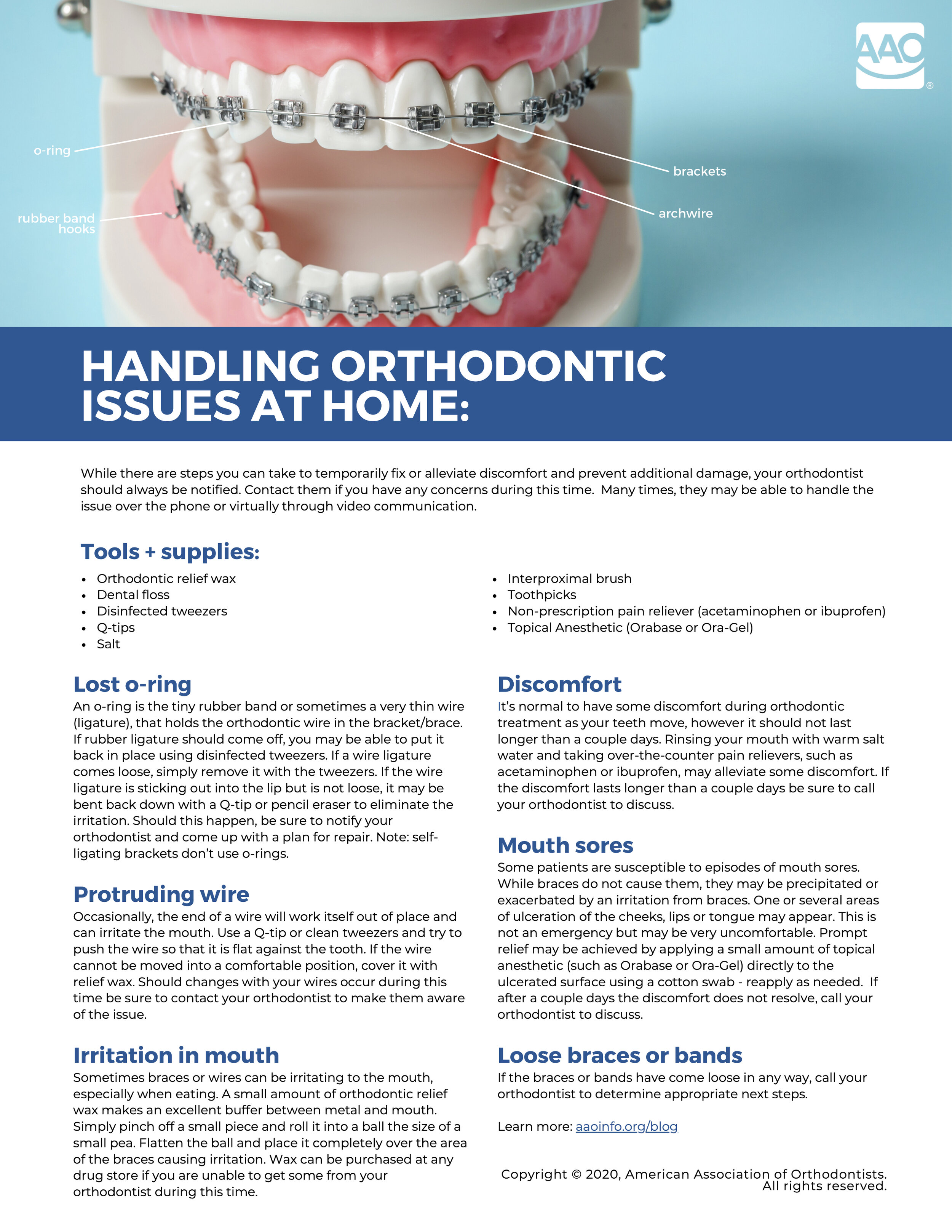 The American Association of Orthodontists (AAO) has a robust blog and they just did a great blog post about how to handle orthodontic issues at home. Like most orthodontists around the nation, our office is currently postponing any non-emergent appointments due to COVID-19. This does not mean that we are not available however! We are going to start implementing VIRTUAL APPOINTMENTS who have braces, Invisalign, or need retainer checks. We have also very excited to announce that we have rolled out VIRTUAL CONSULTS as well for new patients! Stay tuned to our next blog post to learn more!